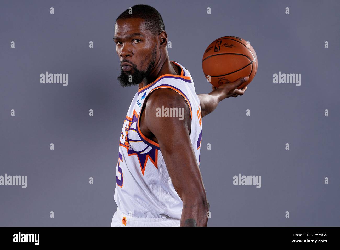 Professional NBA portrait photograph of a male basketball player wearing a Phoenix Suns white jersey (number 35 visible) with orange and purple team colors. The player is positioned in a three-quarter pose facing the camera while holding an official NBA basketball in his right hand at chest level. He has a beard and short hair, displaying a confident, focused expression. The background is a neutral gray studio setting typical of official league photography. The lighting is professional and evenly distributed. This is a standard NBA player headshot/portrait used for official league documentation and media purposes.